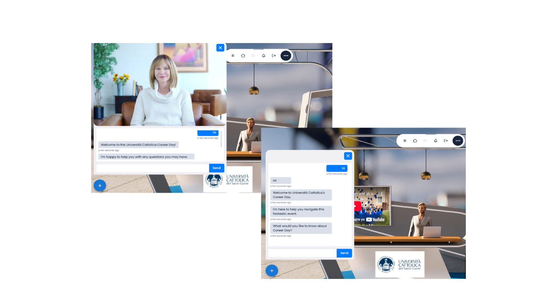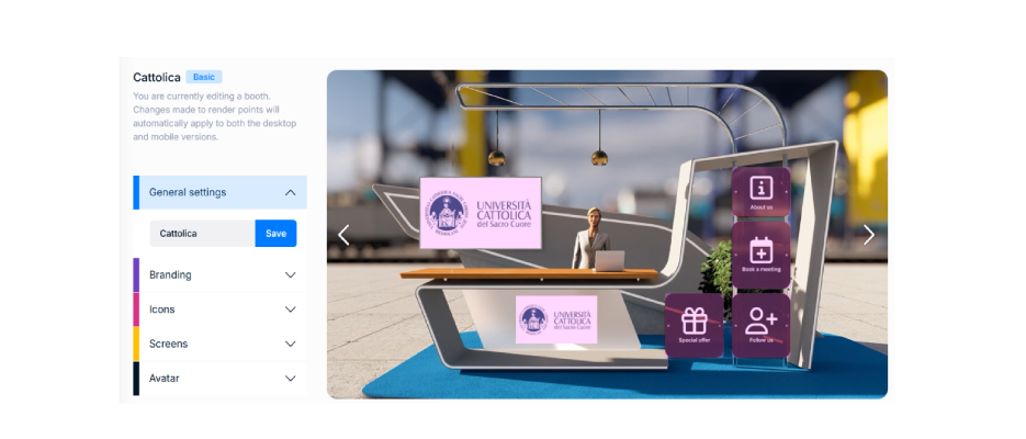 Companies can easily configure their own virtual booth by adding banners, logos, videos, and interactive elements – all tailored to showcase their brand and engage visitors.